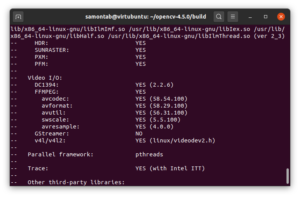 Check that the above command produces no error and that in particular it reports FFMPEG as YES. If this is not the case you will not be able to read or write videos. Double check that every feature you want present in OpenCV is reported correctly. If you’re missing something, make sure to install the missing package and run the cmake line again. In some cases you might need to delete the whole build directory first to get a correct detection. Once you’re happy with what’s shown then we’ll build it. After running the following lines you can go grab a coffee as it will take a long time.